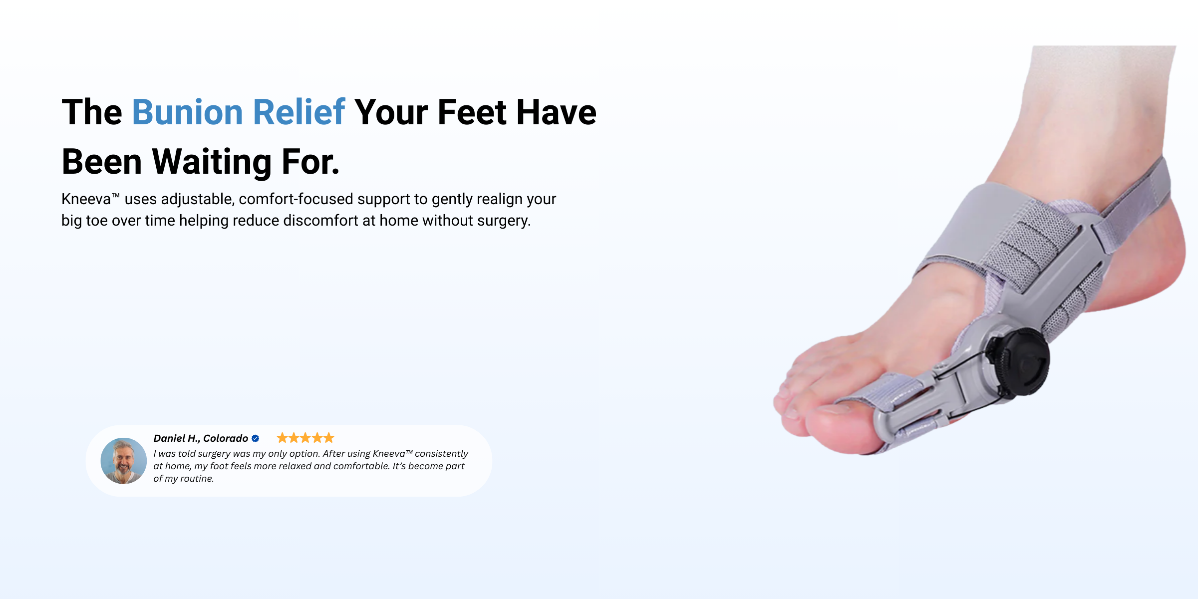 Kneeva™ uses adjustable, comfort-focused support to gently realign your big toe over time— helping reduce everyday discomfort at home, without surgery.